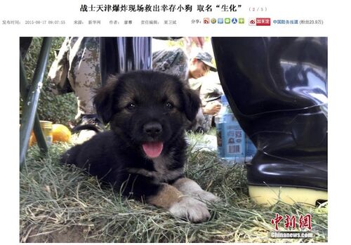 天津の大爆発事件。 北京軍区から派遣された某防化団(国家級核生化(核生物化学)部隊のこと)が、爆心地近くで一匹の子犬を保護した。 子犬は部隊から離れようとせず、部隊兵士たちも"生化(shēnghuà)"と名付けて可愛がっているそうだ。