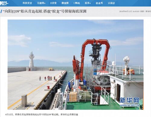 (via. 新华网) 4月12日、中国の水深7000m級有人深海潜水艇「蛟竜(蛟龙)」号と、母船「向陽紅09(向阳红09)」が2016年の蛟竜号試験性応用航海(第37次科学調査)に、青島郊外の国家深海基地の埠頭から出発した。 国家深海基地の専用埠頭なのに、すごく広…
