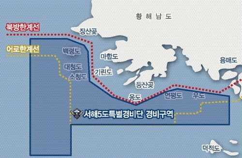 (인천일보) 韓国の国民安全処は4日、中部海洋警備安全本部の"西海5島特別警備団"の発足式を行った。4月1日からワタリガニの漁期が始まり、北方限界線(NLL)(上図の赤点線)近くで増加している中国漁船の違法操業への取り締まりを強化する。 (*)韓国で…