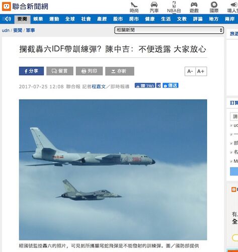 (聯合新聞網 (2017-07-25)) より。27日朝にキャプチャ) 台湾の国防部は25日、中国の人民解放軍空軍の轟-6K(H6K)爆撃機1機が台湾海峡の中間線に沿って飛行したことを発表した。先週から、7月13日、20日、24日と、台湾周辺での中国軍機の活動が活発化し…
