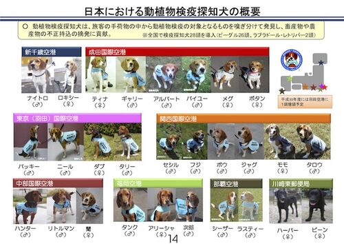 (動物検疫所より) 旅行者の手荷物や国際郵便物の中から、動植物の検疫検査を必要とする肉製品などを嗅ぎ分ける「検疫探知犬 (quarantine detector dog)」。 アフリカ豚コレラ(ASF)、豚コレラ(CSF、古典的豚コレラ)、口蹄疫、鳥インフルエンザなどの家畜…