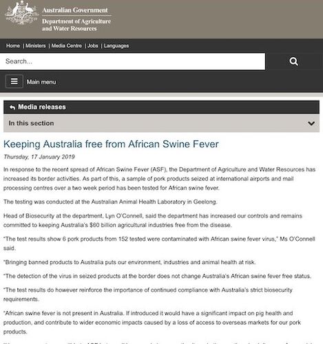 (DAWR) 東欧やロシア西部、中国で発生が続くアフリカ豚コレラ。 周辺の国でも、空港や港で、中国からの旅行者・渡航者が持ち込んだ豚製品(ソーセージや餃子など)から、アフリカ豚コレラ(African Swine Fever(ASF))のウイルスのDNAが検出されている(アジ…
