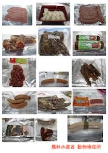 (農林水産省) 日本、台湾、韓国の、空港や港の税関で発見された豚加工品や豚肉を使った食品のうち、アフリカ豚コレラ(African Swine Fever(ASF)) のウイルスのDNAが検出されたものの一覧。 2019年4月末までに確認され、公式に発表された豚加工品・食品の画…