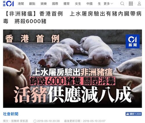 (香港01より) 香港特別行政区政府は10日夜、新界北区の上水屠畜場で、アフリカ豚コレラのウイルスが確認されたと発表した。屠畜場の豚6000頭が殺処分される。 香港でのアフリカ豚コレラ (African Swine Fever, ASF) のウイルスの確認ははじめて。 香港域…