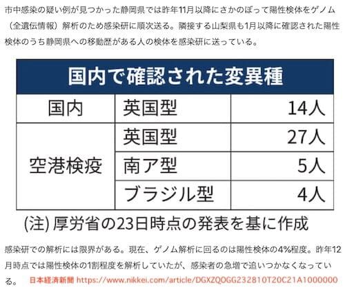 新型コロナウイルス(SARS-CoV-2)の変異株の、国内での感染者の発表と市中感染の疑いと報道されている。 国立感染症研究所(NIID)による発表によると、1月25日時点で、外国滞在歴がある人が7人、空港検疫により確認された27人(英国型21人、南アフリカ型2人…