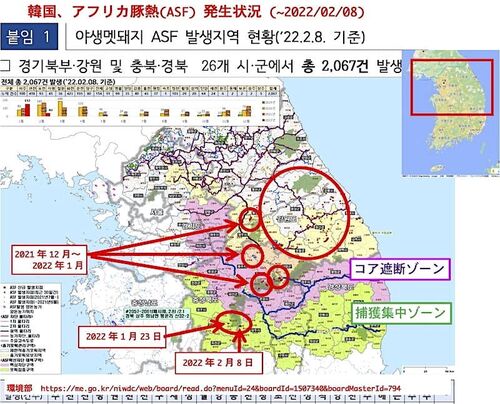 韓国、環境部は2月8日、慶尚北道の尚州市で発見された野生イノシシの死体5体からアフリカ豚熱(ASF、旧称:アフリカ豚コレラ)ウイルスが検出されたと発表した。慶尚北道で確認されたのははじめて。 韓国はアフリカ豚熱(ASF、旧称:アフリカ豚コレラ)の封…