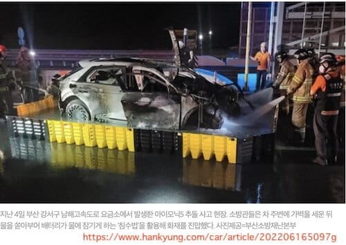 「アイオニック5」の衝突時の速度は時速90~100km。 運転手と助手席の同乗者の死亡原因は、車両火災ではなく、スピード・オーバーとシートベルト未装着によるもの。 事故調査官によると、衝突から1〜2秒で爆音とともにボンネット付近から火の手が上がった。ア…