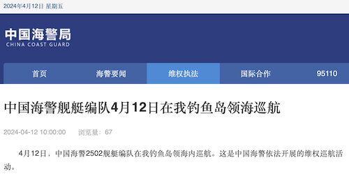 (NHK X(twitter)より) 4月12日、午前10時半ごろ、中国海警局の船4隻が尖閣諸島の南小島と大正島の沖合で相次いで日本の領海に侵入した。4隻はおよそ2時間にわたって領海内を航行したあと、いずれも午後0時半ごろまでに領海を出た。 中国海警局は公式サイ…