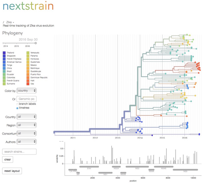 ジカ熱のウイルスの、ゲノム系統図のインタラクティブ・マップ(ゲノム・インタラクティブ・系統図?)を教えていただいた。(via. Twitter)