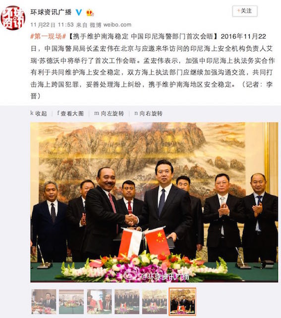 中国海警局の孟宏偉局長とインドネシア海上安全保障局(BAKAMLA)のArie Soedewo中将の会談では、両国の海上法執行組織の間の、開かれた対話による今後の協力について意見交換を行った。