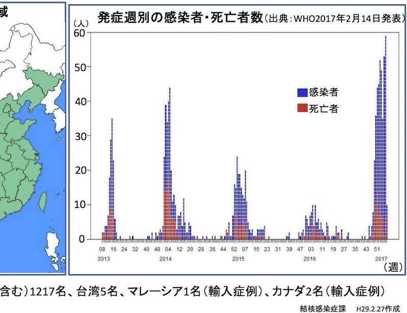 国家衛生・計画育成委員会(国家衛計委)の発表によると、2017年2月に確認された感染者は160人(うち死亡61人)だった。2月が28日間と少し短い事を考慮しても、1月の感染者192人(うち死亡76人)からやや減少している。