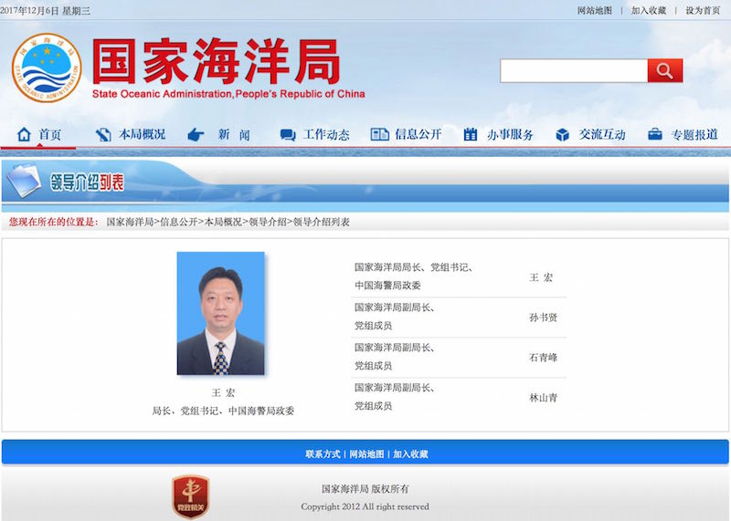 現在、指導部公式ページには局長と副局長3人だけが掲載されている(2017年12月6日に確認)。王宏局長は、中国海警局の政治委員(政委)を兼任している。