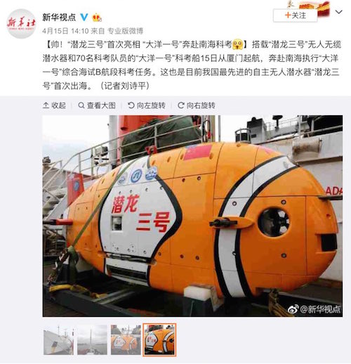 4月15日、中国の総合海洋科学調査船「大洋一号」が、西太平洋での、今年の第2次海洋試験(综合海试B航段任务)に福建省アモイ市の港を出発した。4500m級の自律型無人潜水機(AUV)の三号機、「潜竜三号」の最初の潜水試験を行う。