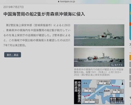 中国海警局の船2隻が青森県沖領海に侵入|Web東奥(2019年7月27日)