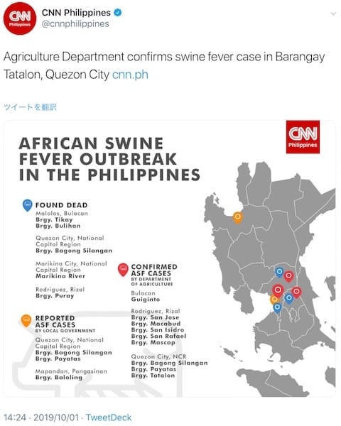フィリピン政府による公式発表は9月9日が最初だが、実は、8月中旬にはASF発生したのはほぼ確実と考えられていた。