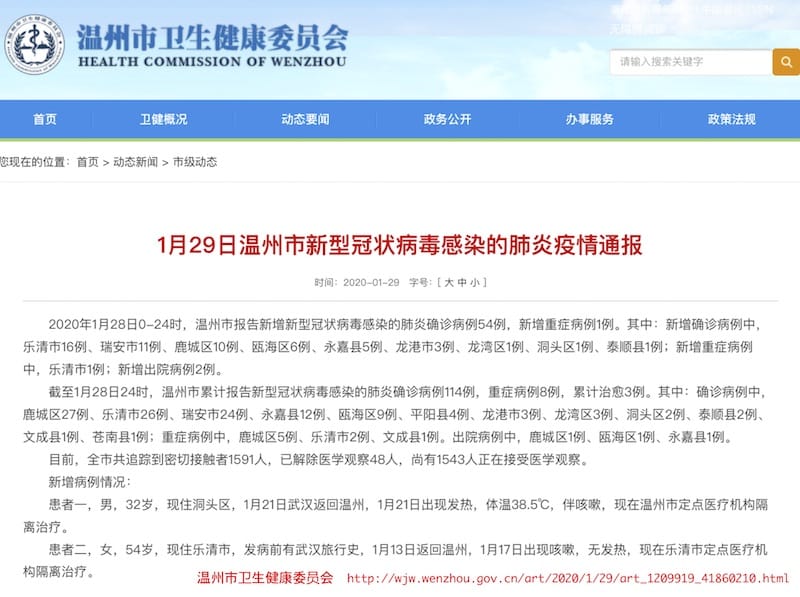温州市では、1月31日までの感染者241例中、楽清市(乐清市)69例、瑞安市48例、鹿城区36例、永嘉県(永嘉县)23例、の順番。温州市中心地に近いあたりで多いよう。