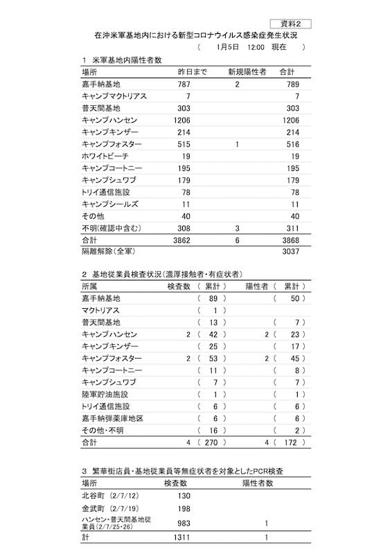 年末年始の1週間で、キャンプ・ハンセンでは250人、嘉手納で約70人が増えたのですね。一方、キャンプ・フォスターの従業員の陽性確定はゼロだったようです。