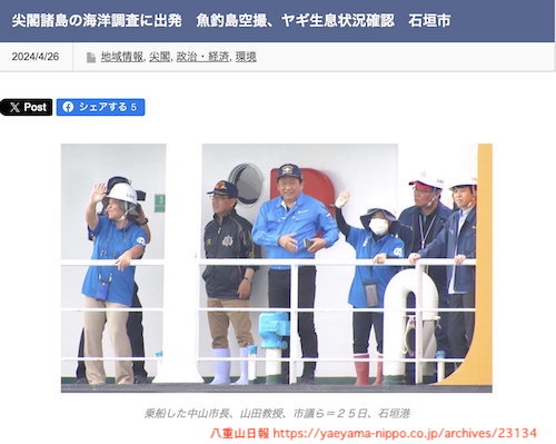 石垣市の尖閣調査開始 市長も乗船、3回目 | 共同通信 (2024/4/25)